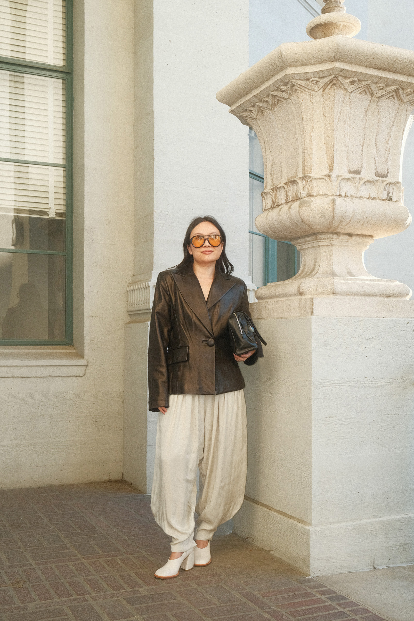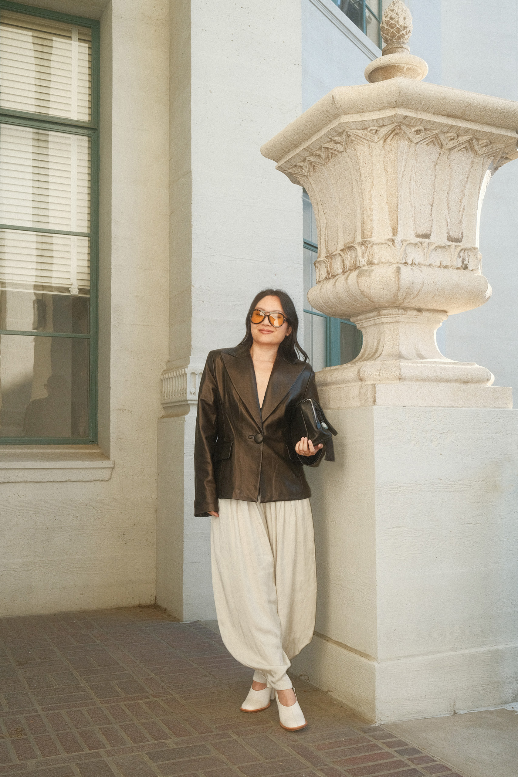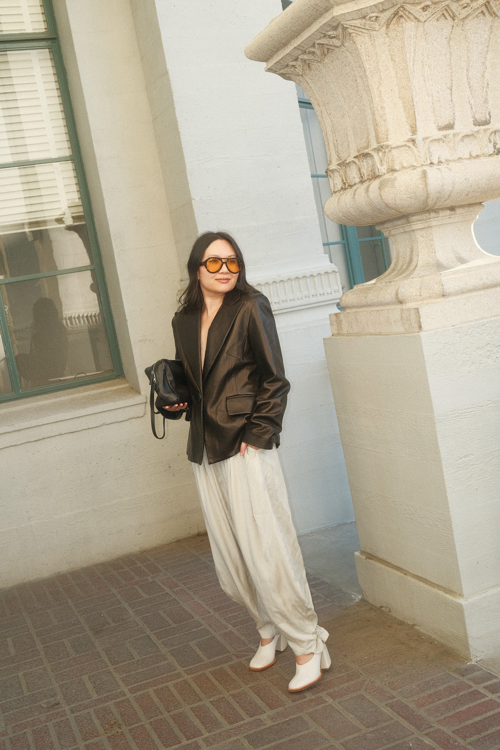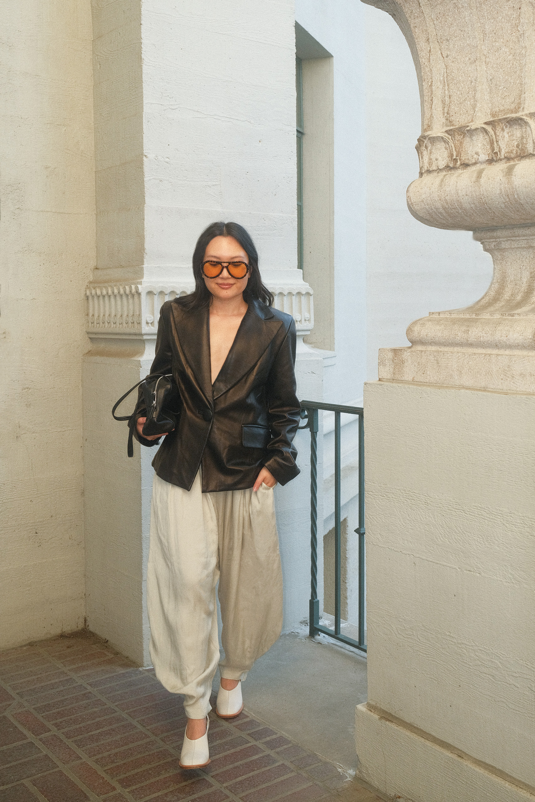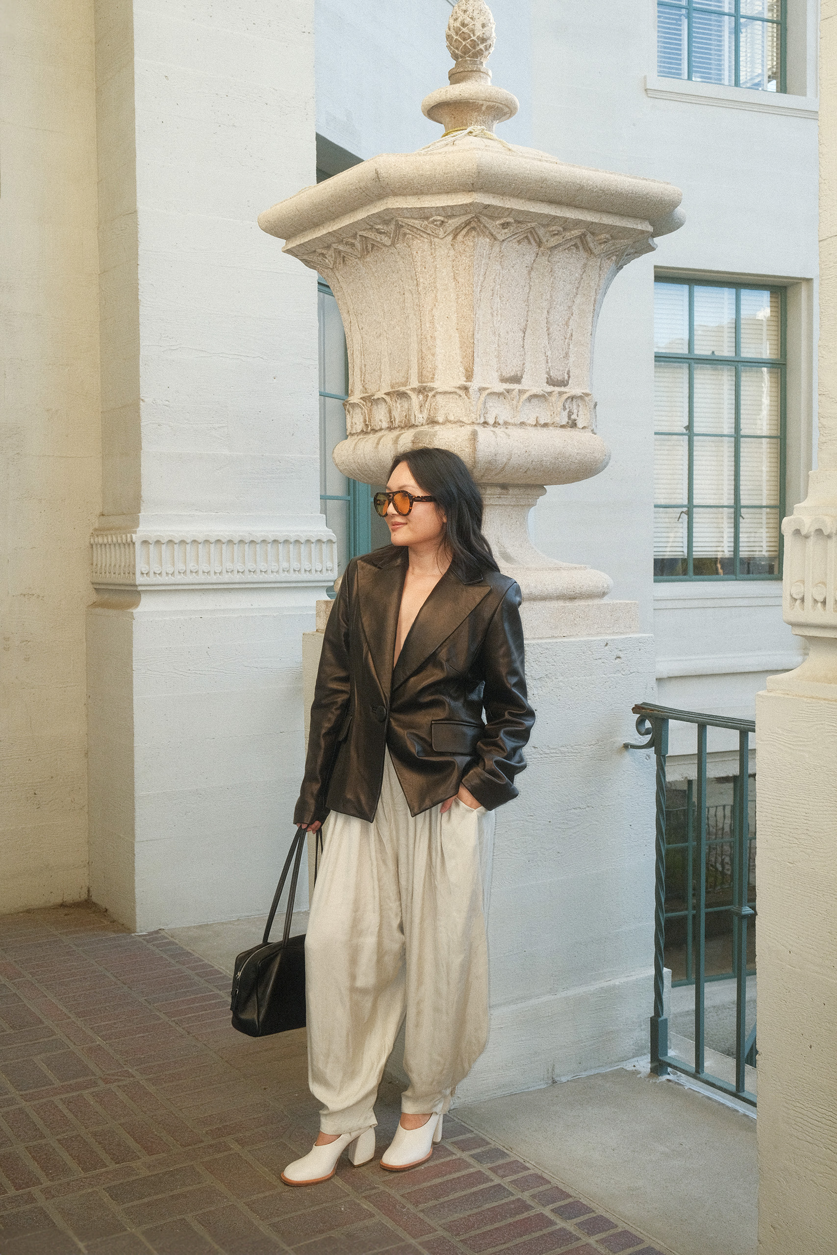 In my head, I associate the trend with summer dressing, but I wanted to challenge myself to make it work for colder weather somehow. That’s when I remembered this vintage leather blazer that my grandmother passed down to me few years ago sitting in my childhood bedroom closet waiting for its moment. Between the pants and the glove pumps, this outfit feels very Alaïa-coded, no? Come summer, I’ll be styling the pants with sleek flip flops, a simple tank, and statement jewelry.