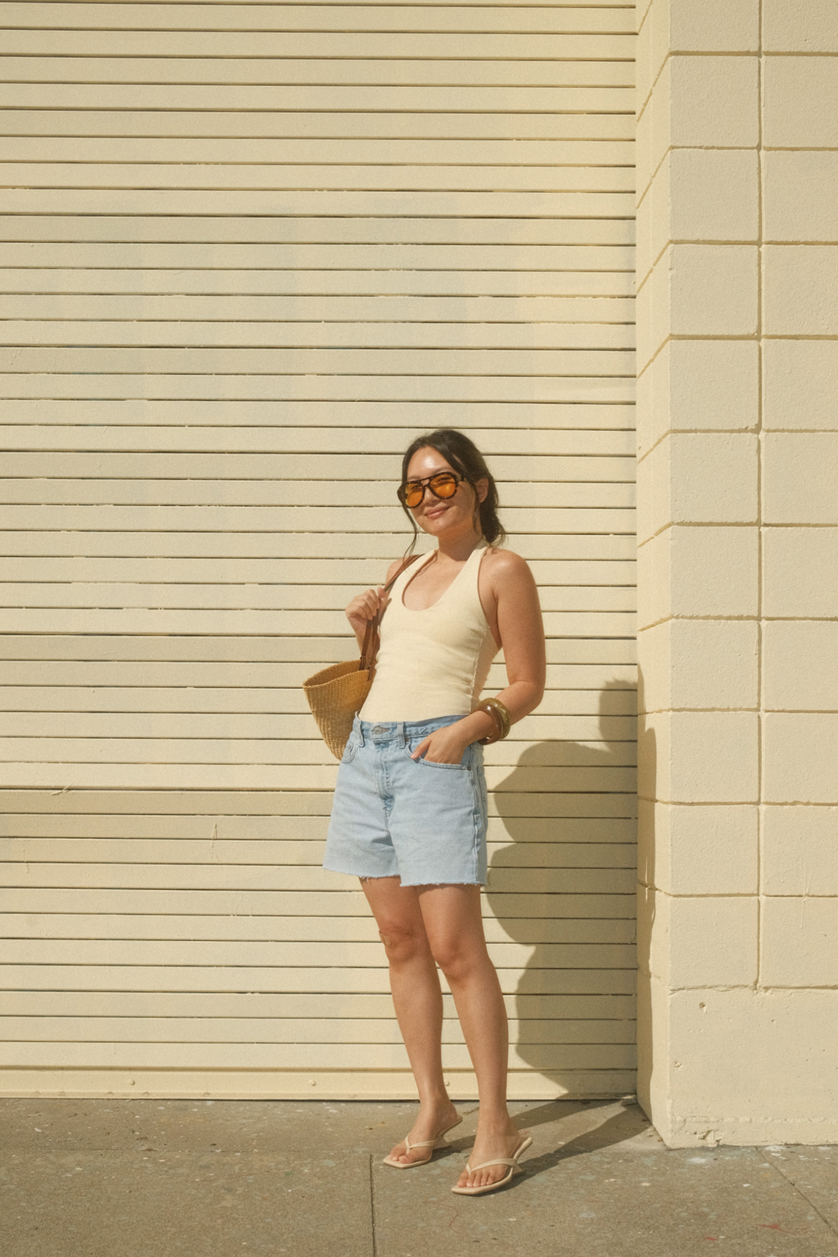 Okay, I’m still not over butter yellow! Squeezing in the last month or so of wear before the trend inevitably dies with the start of fall. Also taking the opportunity to wear a few of my other favorite summer pieces: chunky bangles, basket bags, and my new vintage Levi’s shorts. After getting a longer, more structured pair last summer, I realized I also needed something a bit looser and slouchier for that effortless appeal.