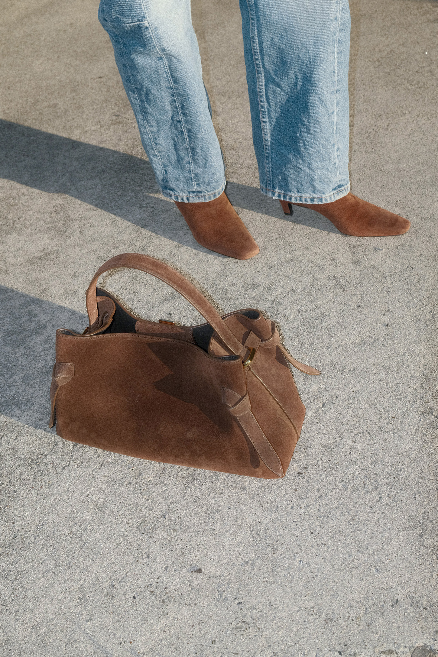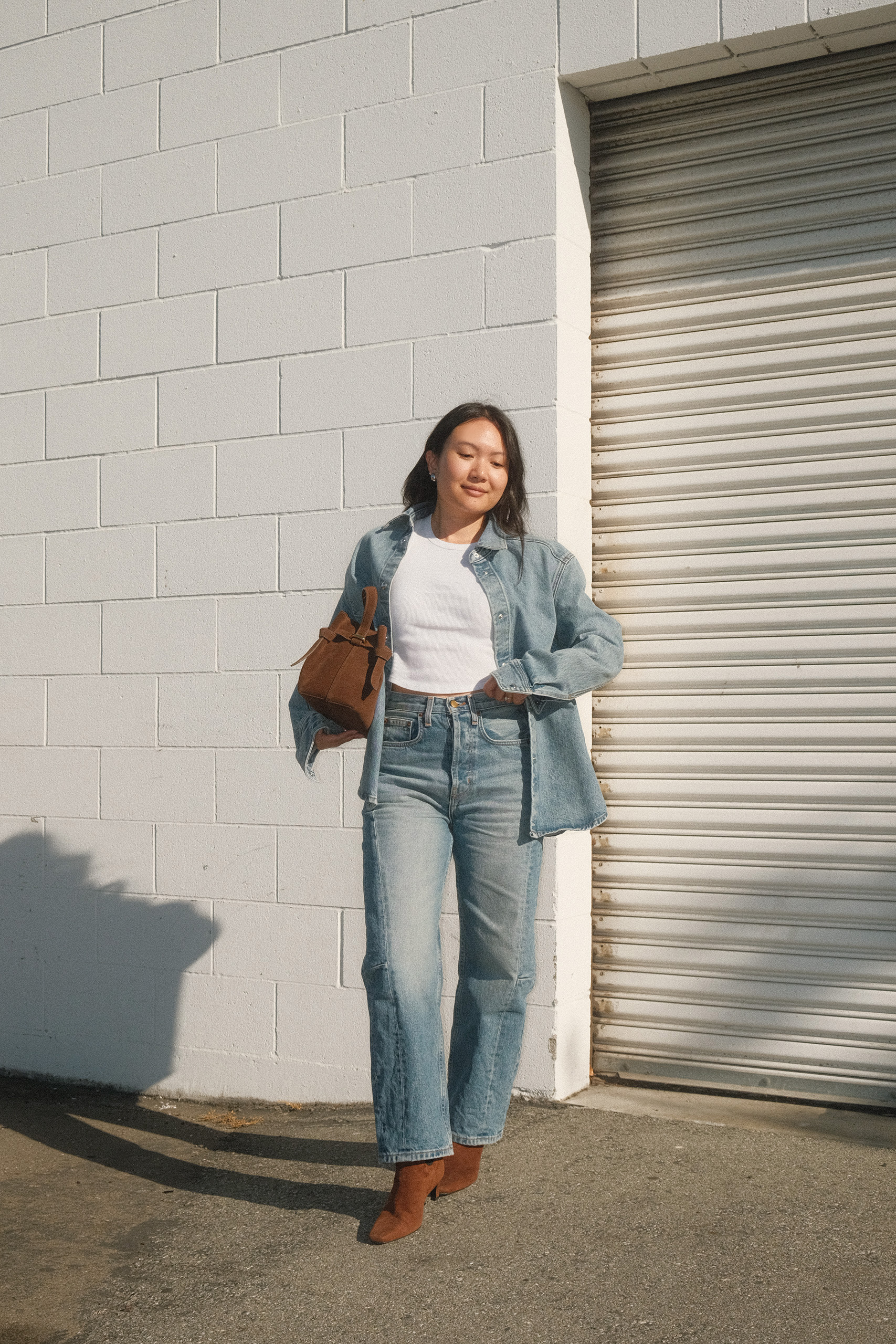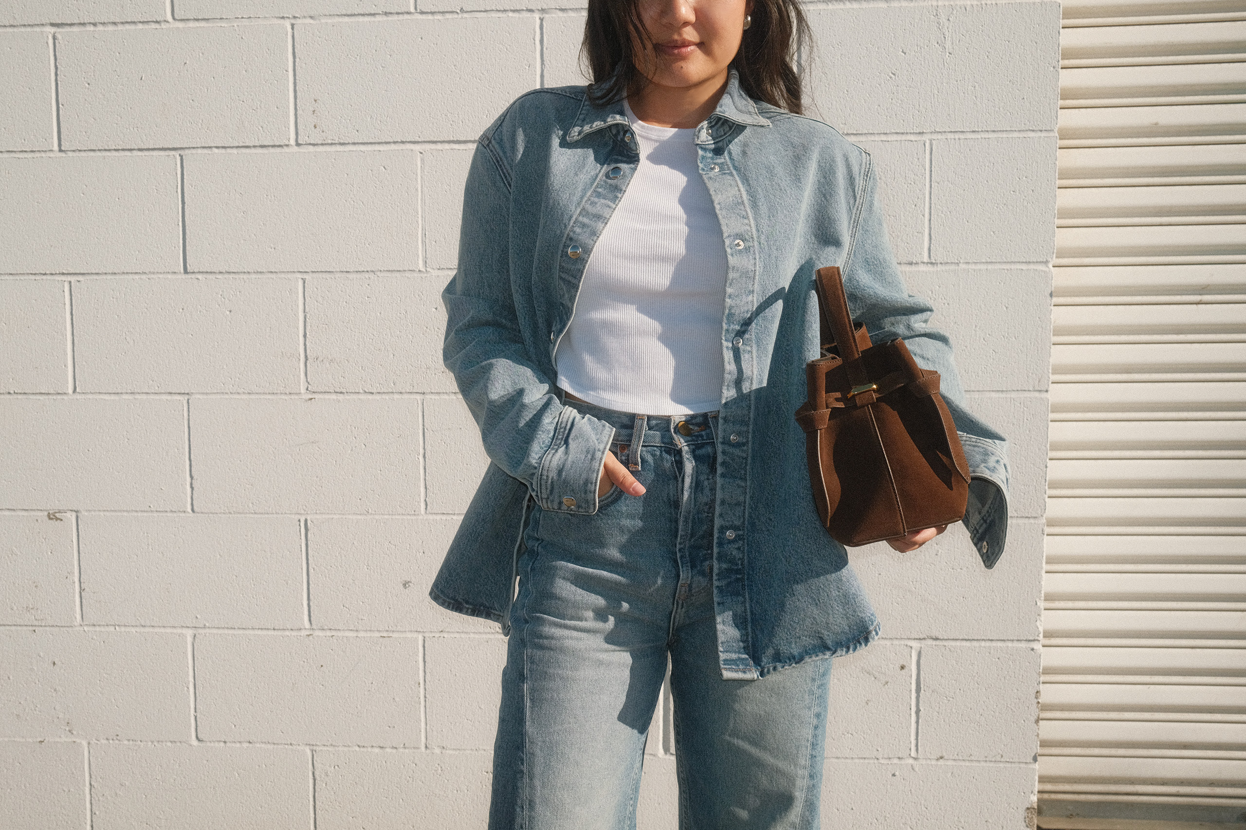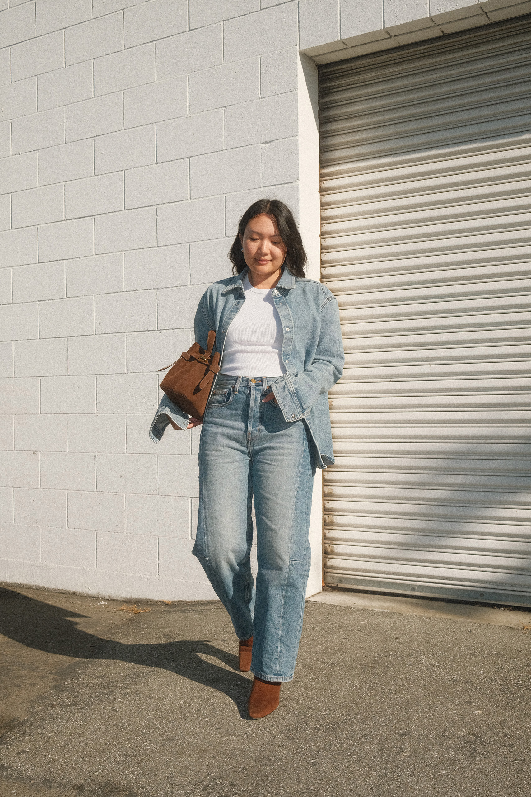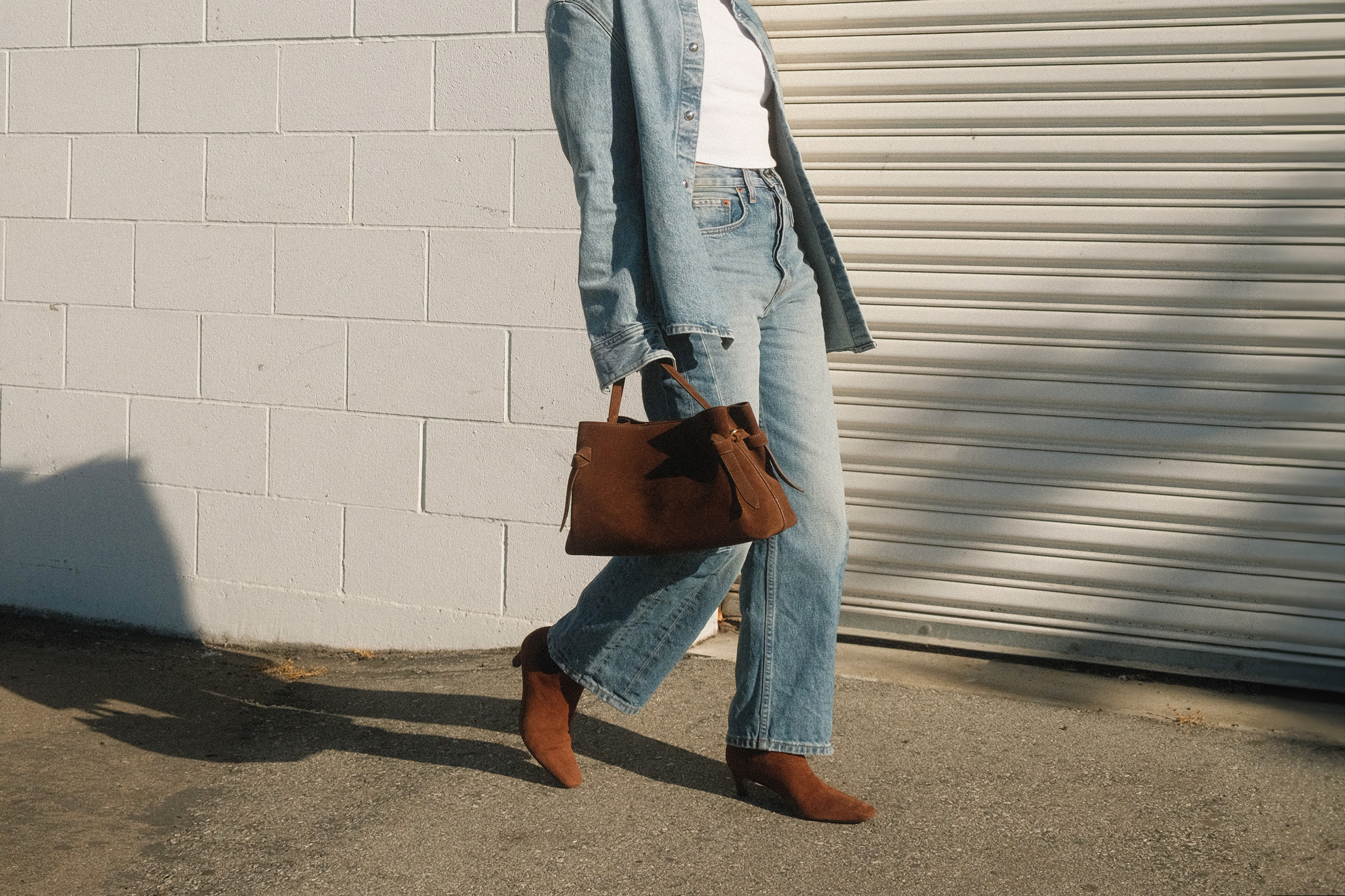 My first instinct is always to pair dark brown with denim, so that’s exactly what I did here, using two of my most worn denim pieces (that just happen to match each other perfectly) to ground the accessories. The touch of rich suede helps to elevate the simplicity of the outfit and make it feel more seasonal. Chocolate brown with gray and with navy are two other color combinations I’m excited to play around with this season.