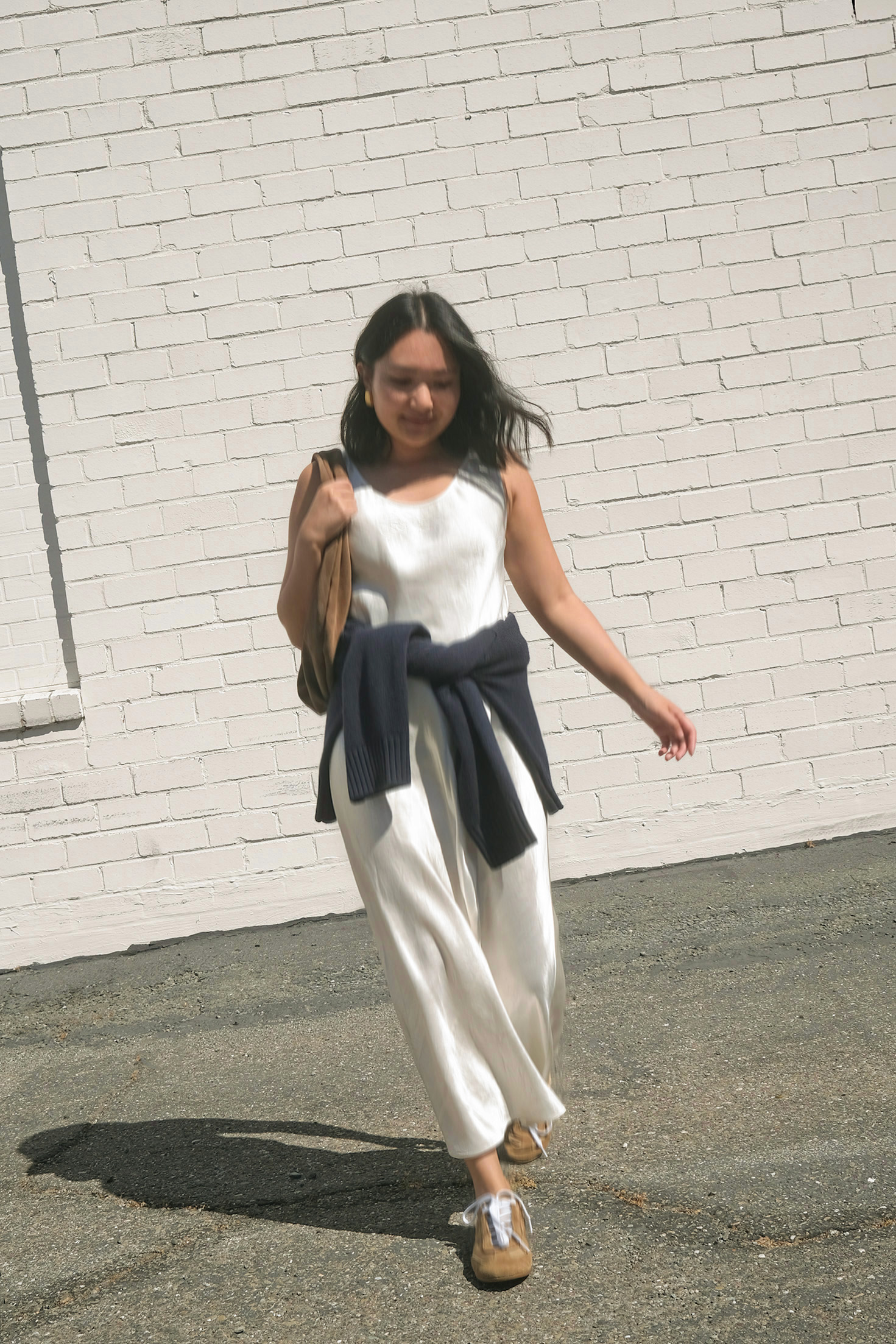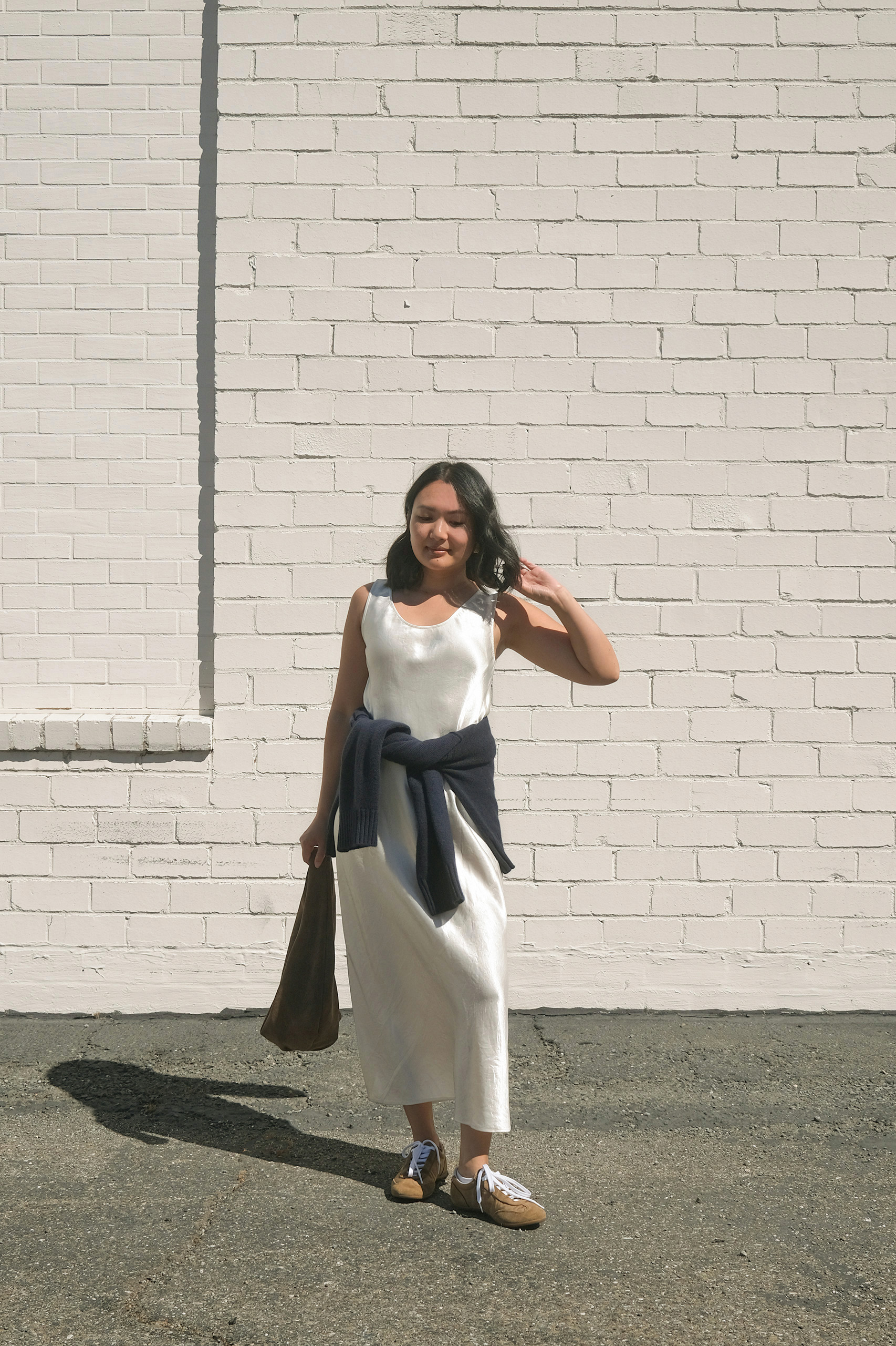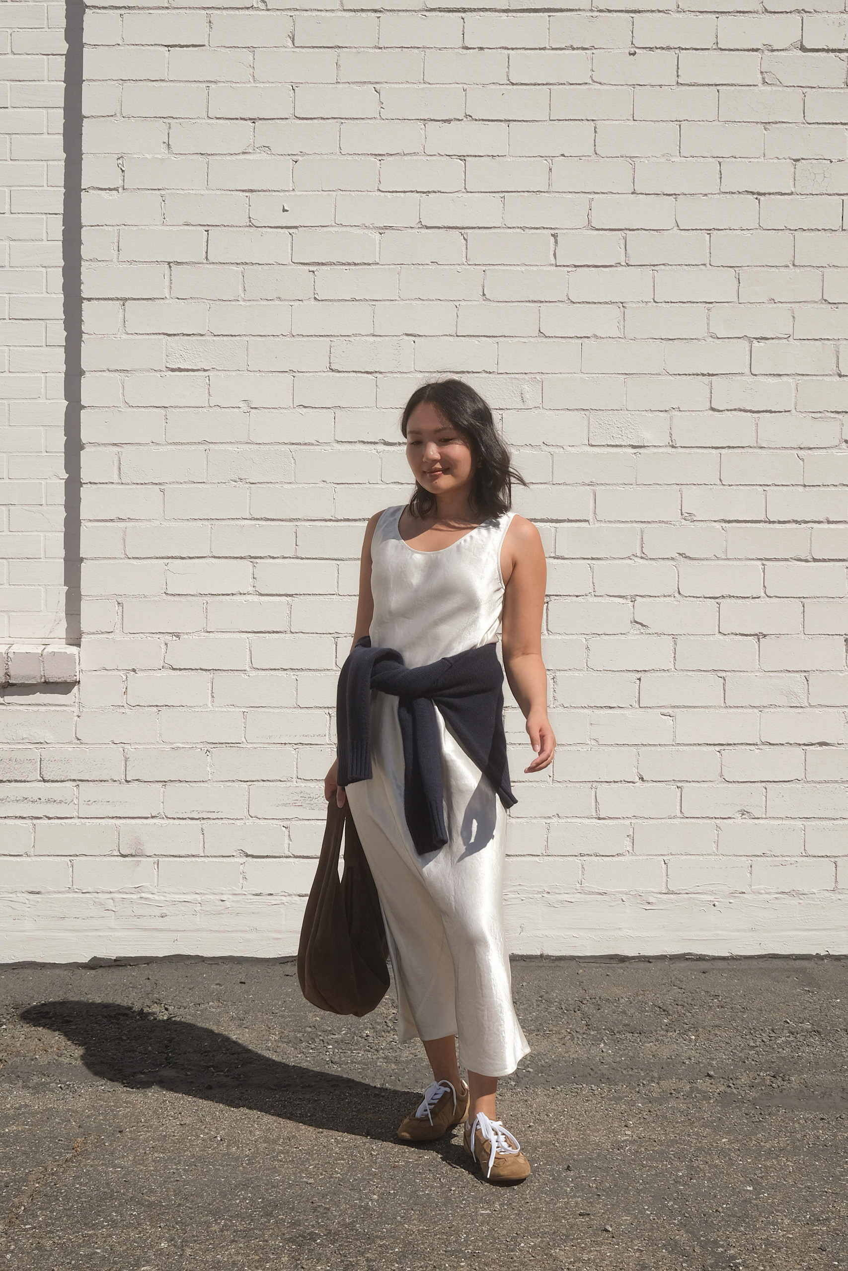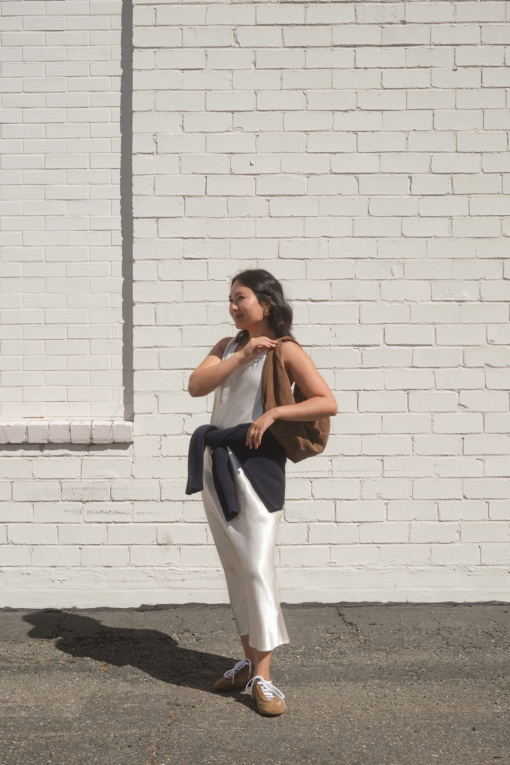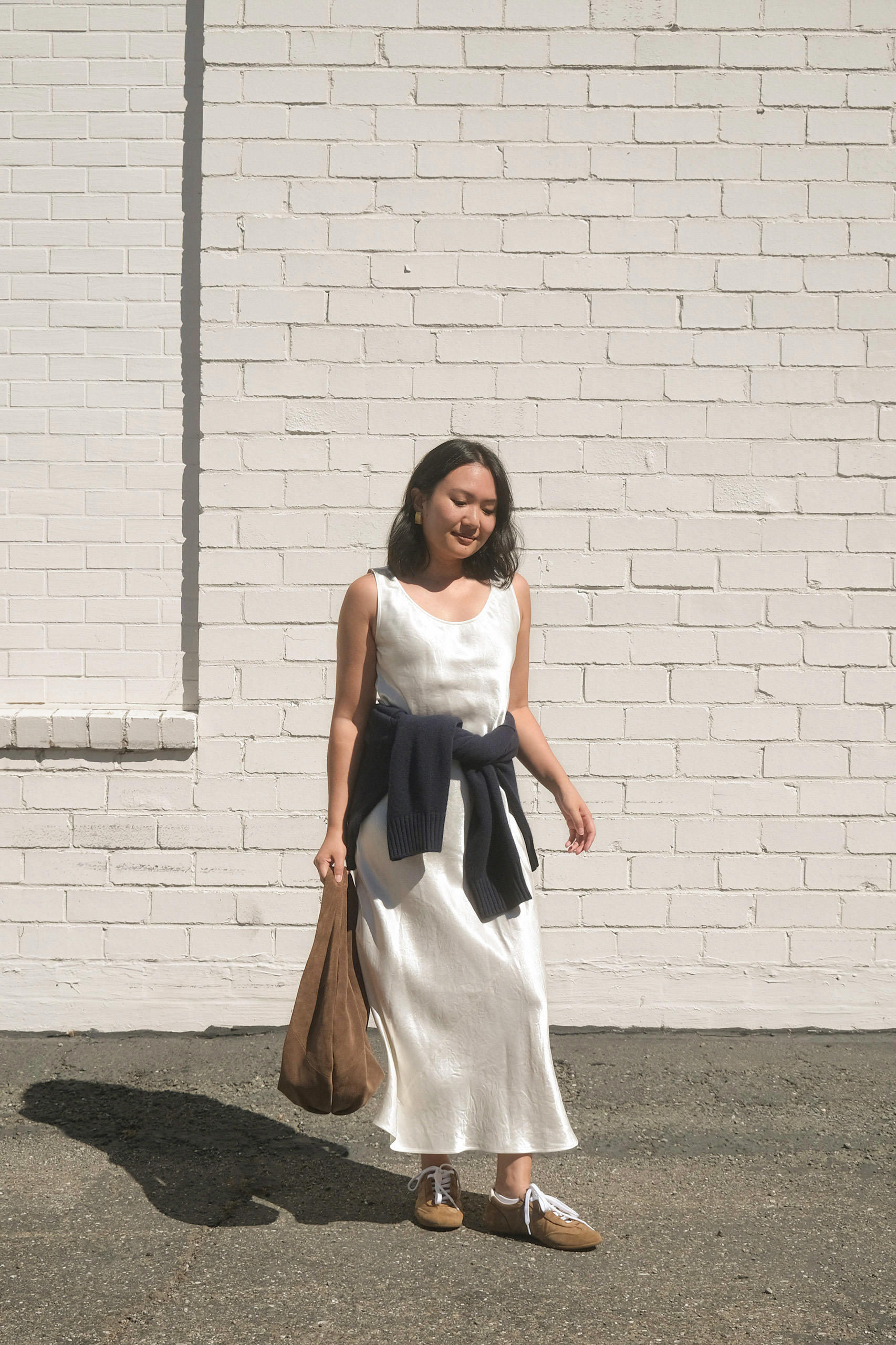 cream maxi slip dress outfit