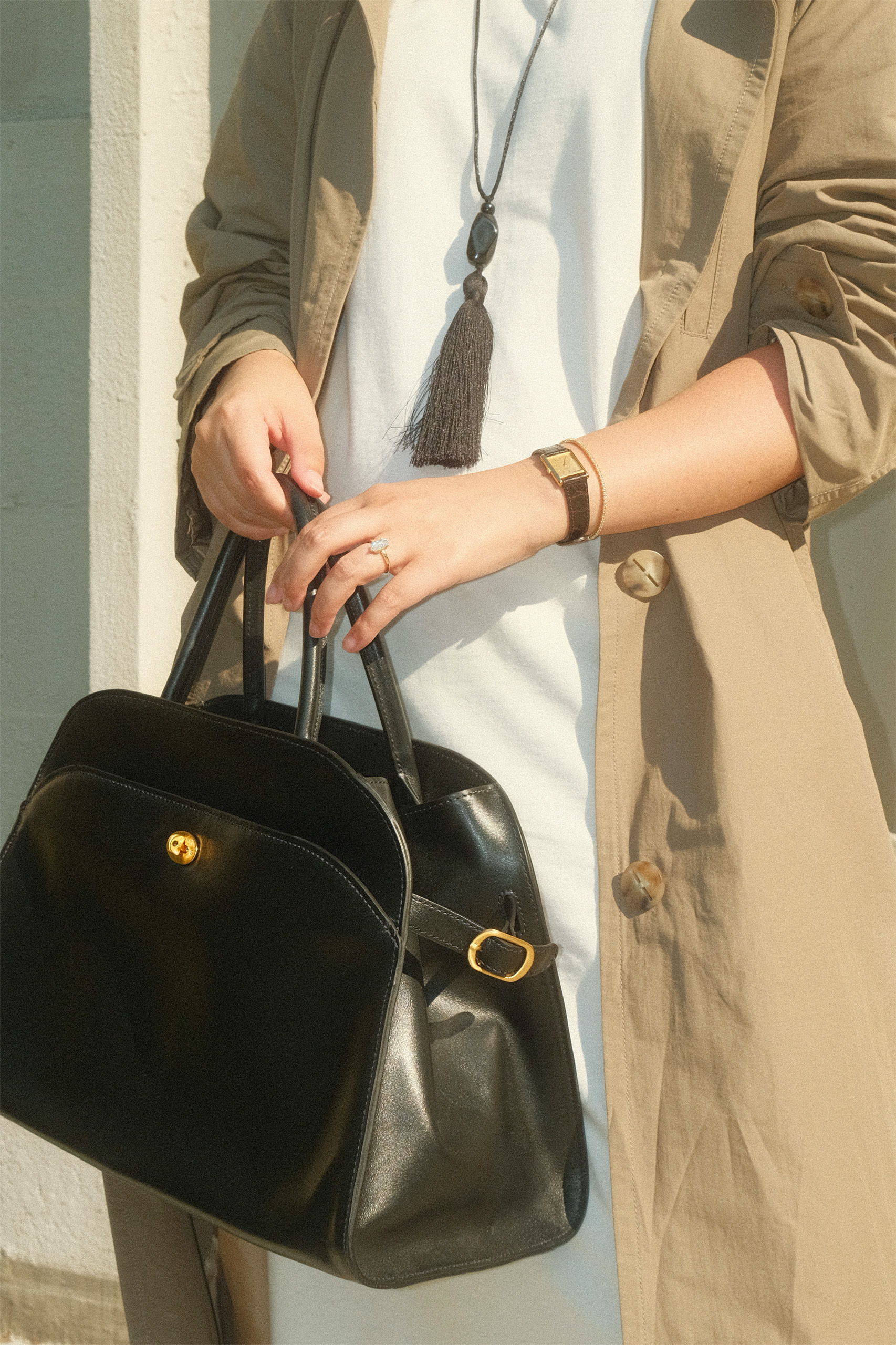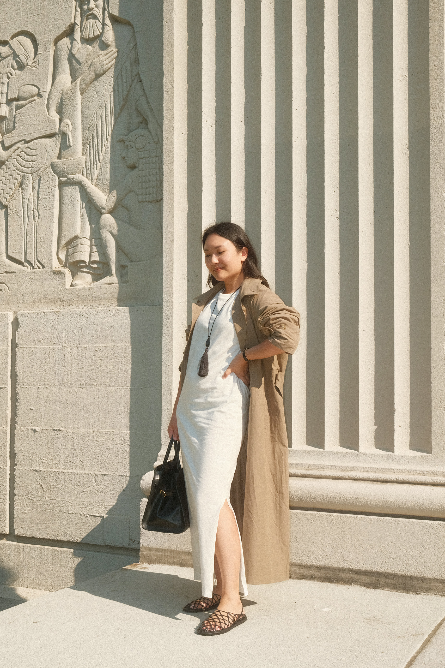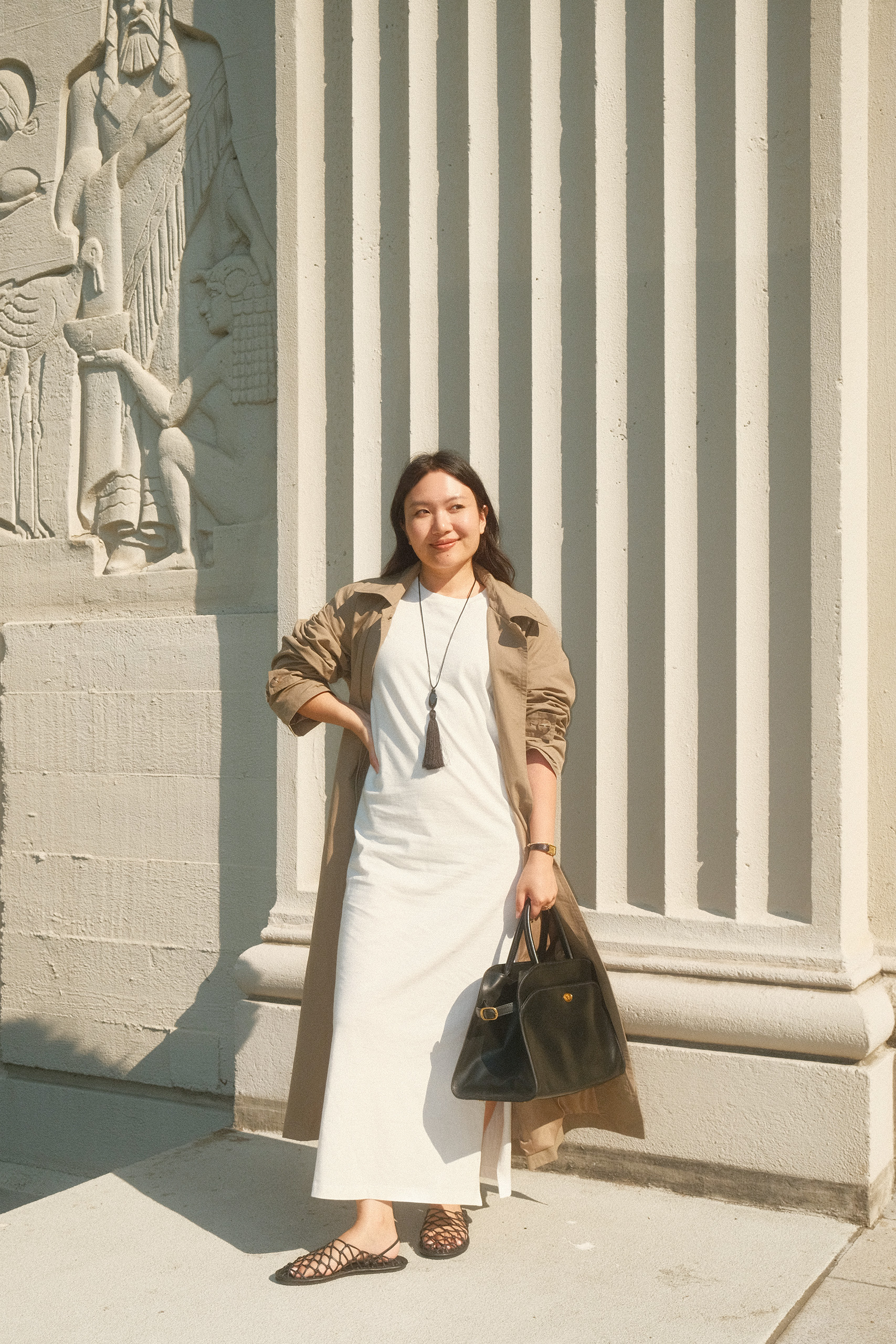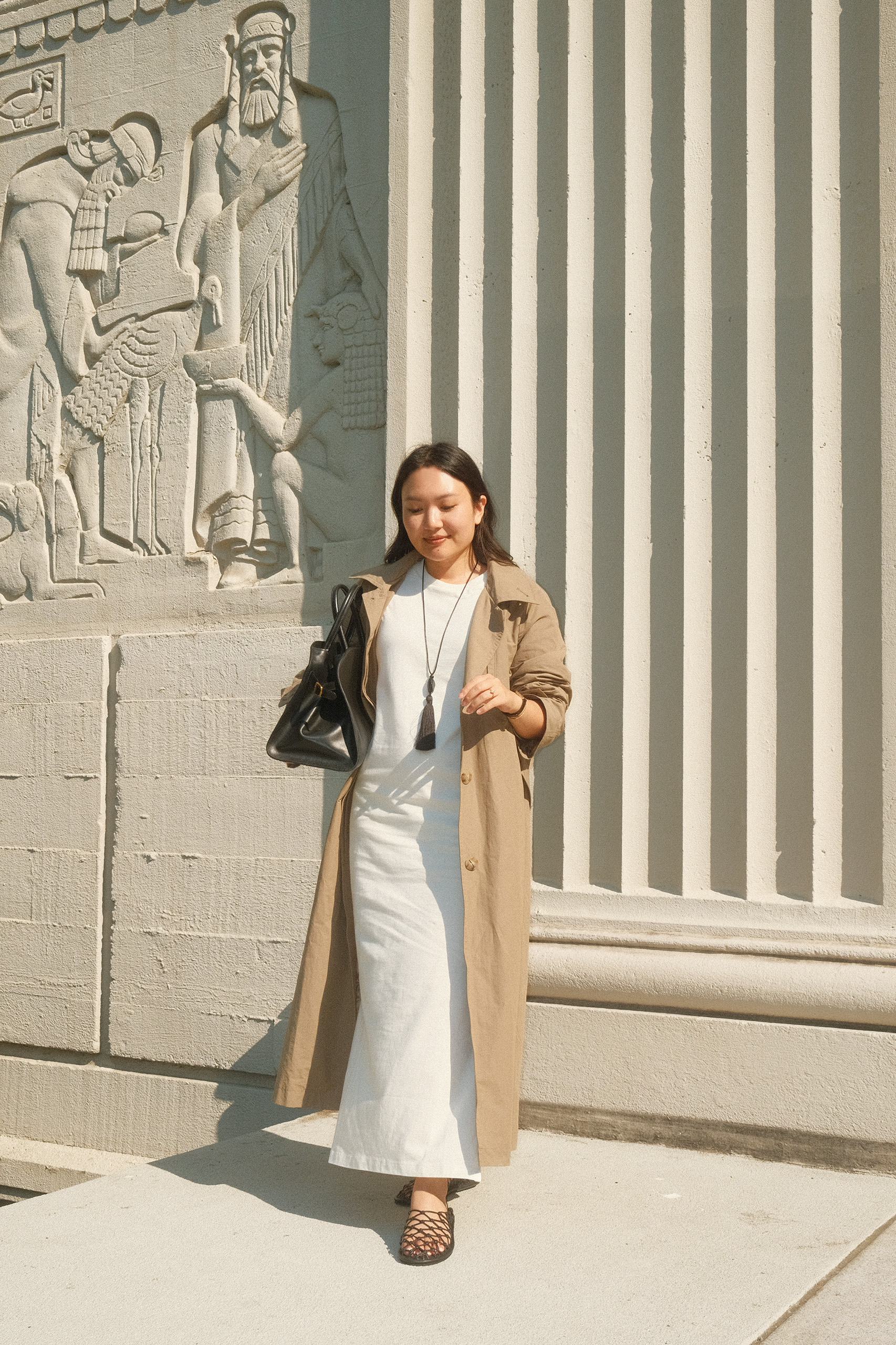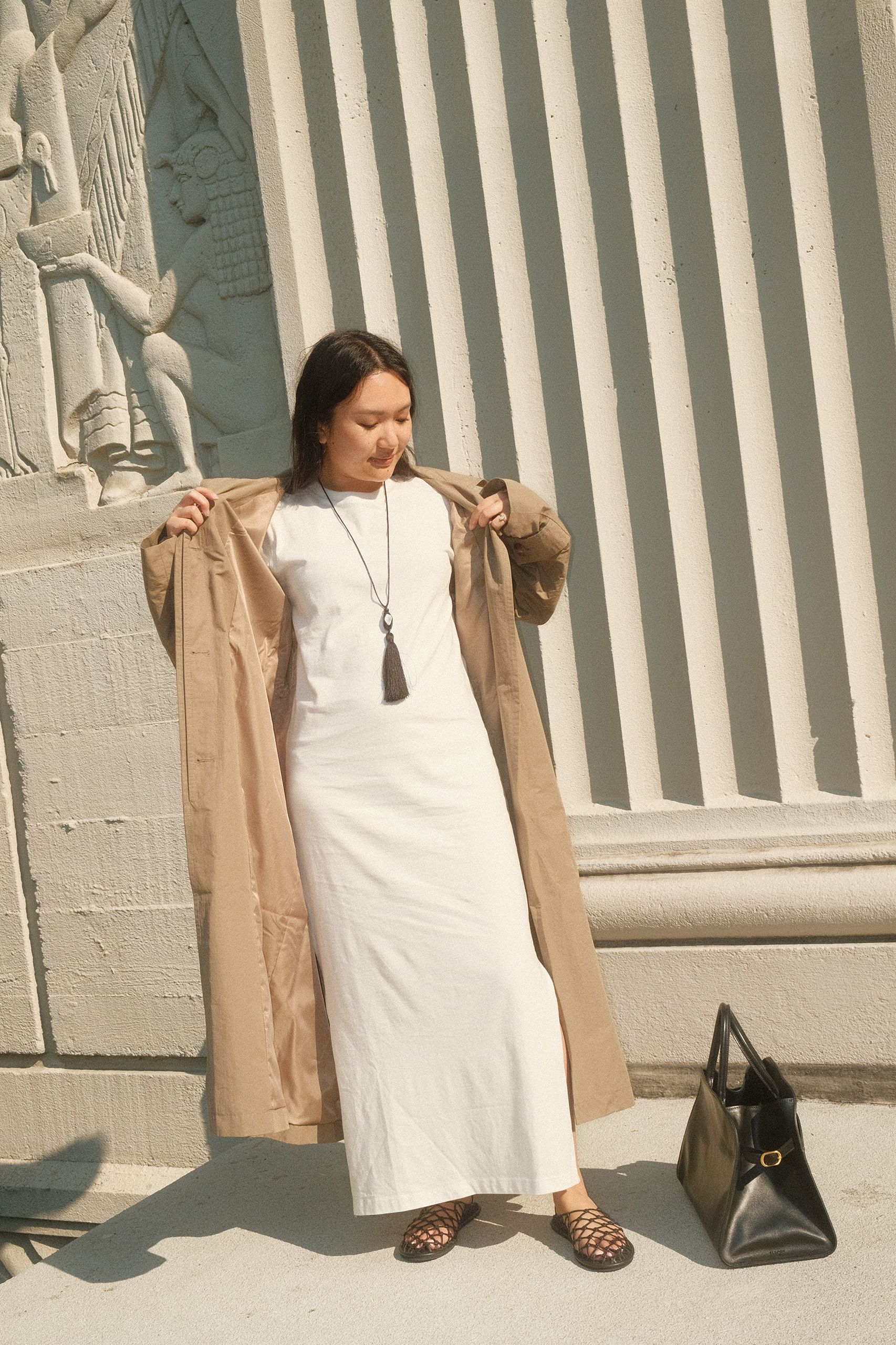 7.16.2025Mijeong Park trench, Reformation dress (similar here), Emporio Armani sandals, Elborn bag, Etsy necklace, vintage Seiko watch, Aurate bracelet c/o