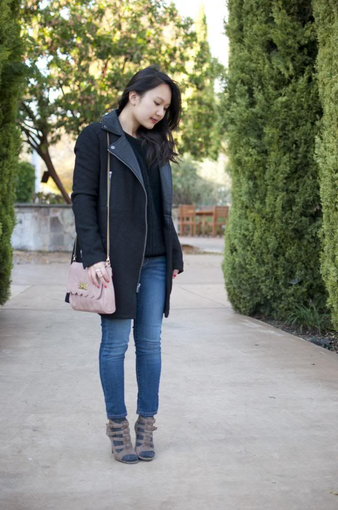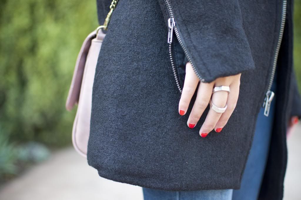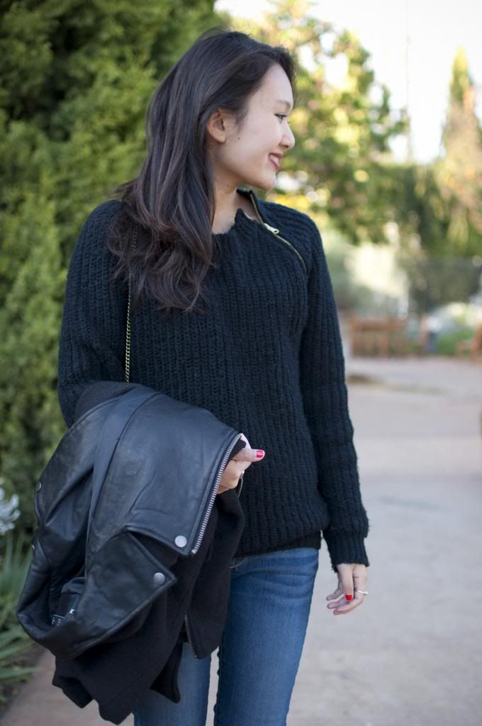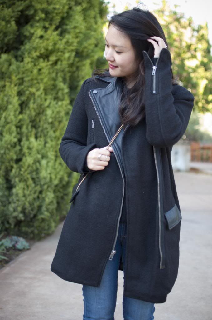 My intolerance for colder weather makes me dread dressing in the winter time. I try to avoid wearing heavy coats when possible, instead getting creative by layering thinner pieces. That being said, I decided it was time to invest in a real coat that could last me through several winters. This ASOS one is a classic shape with two details that I can never resist: leather and zippers. Plus, the wool and real leather materials will ensure that it’ll last. Expect this piece to appear often on the blog. Worn here with my favorite sweater (again with the zippers– considering getting it in the white color too), and $2 flea market ring.